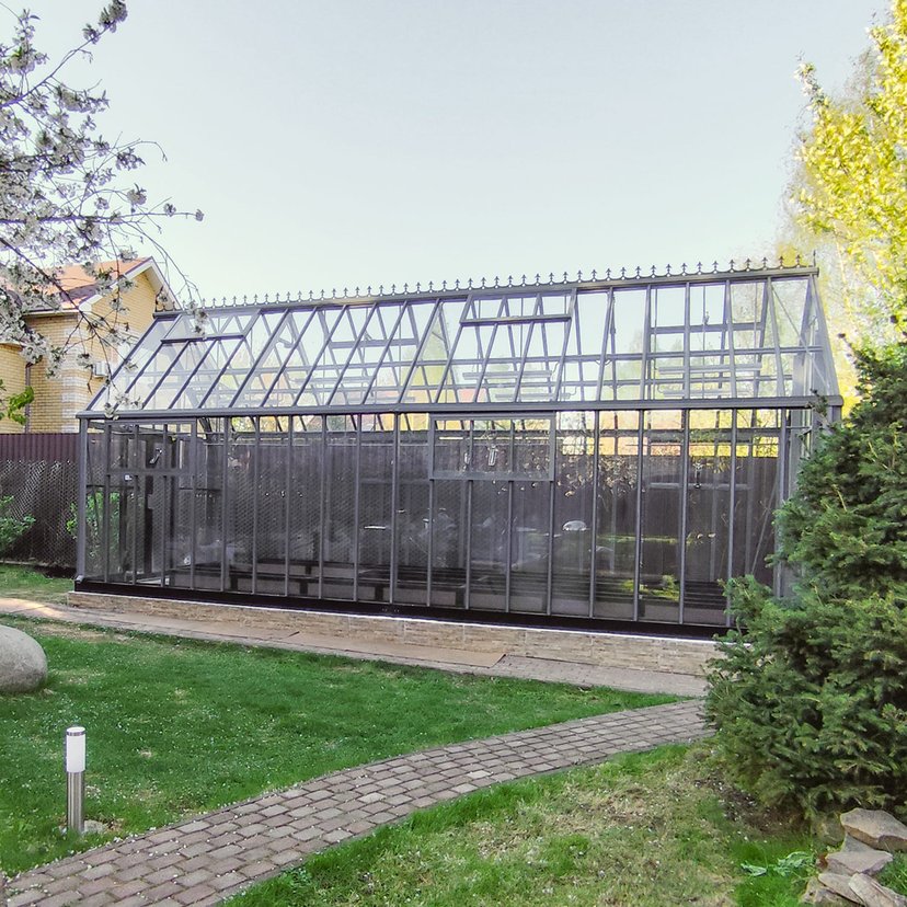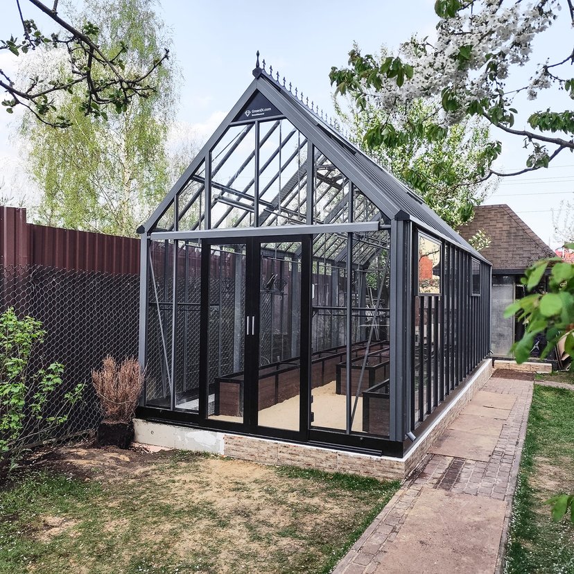 Привлекательная и стильная теплица Model 2 на цокольном фундаменте, размером 3х6 м. Каркас со встроенной водосточной системой. Комплектация -Luxe. Дополнительно установлены торцевые полки.