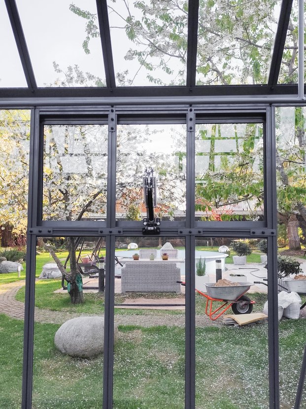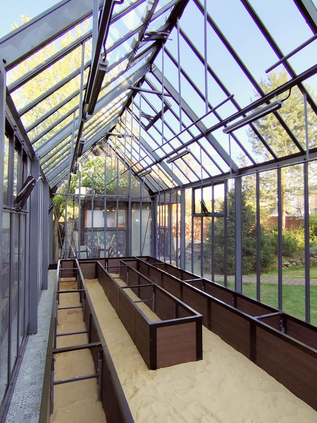 Теплица "Model 2" Классик (2,5х4 м) в комплектации Luxe с грядками из алюминия и ДПК высотой 45 см, усиленными перилами и стяжками, а также системой проветривания жалюзи. Фото сразу после монтажа.